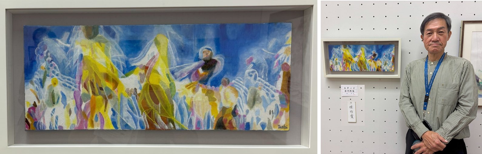 今中利信様の受賞作品の「ステージ」について作品誕生の経緯などお聞きすると、お孫さんが川崎で開催されたストリートダンスの大会に出場した際に撮影したビデオをスローモーションで見ているとステージの光線、動き、色合いの軌跡などを表現したくなり、約2か月で描き上げられてとのことです。作品を鑑賞しているとステージの光線や衣装、動きが軌跡のように伝わってきてとても感銘を受けました。