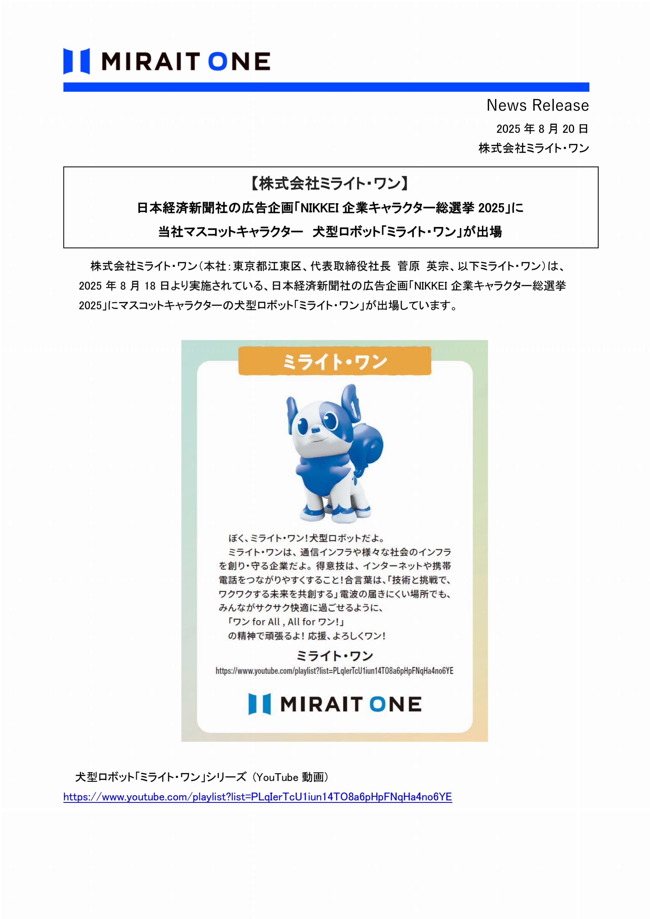 日本経済新聞社の広告企画「NIKKEI企業キャラクター総選挙2025」に株式会社ミライト・ワンのマスコットキャラクター犬型ロボット「ミライト・ワン」がエントリーしています。